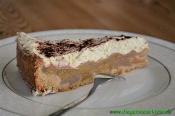 Am nächsten Tag die Sahne mit Vanillezucker und Sahnesteif aufschlagen, auf den Apfelbelag streichen und mit dem Kakaopulver bestreuen.