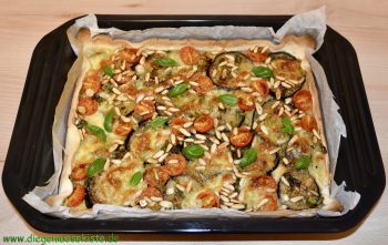 Eine flache Auflaufform mit Backpapier auslegen, den Teig ausrollen, in die Form geben und dünn mit Senf bestreichen. Mit den Auberginenscheiben dachziegelartig belegen. Dann Parmesan, Mozzarella, Zwiebelringe, Tomaten und Pinienkerne darauf verteilen. Kräftig mit Salz und Pfeffer würzen und etwas Olivenöl darüber geben.