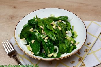 Die Menge reicht für 4 Personen als Vorspeise oder Beilagensalat. Statt Pinienkernen können Sie auch gehackte Haselnusskerne verwenden.