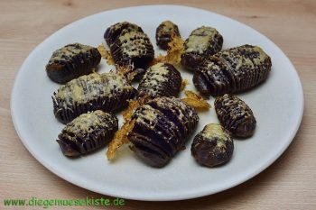 Die Fächerkartoffeln passen gut zu Kurzgebratenem, überbackenem Lachsfilet oder Pfannengemüse mit Soße.