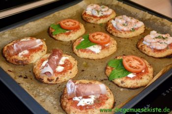 Teig auf einem mit gefettetem Backpapier belegten Backblech zu 8 – 10 kleinen, etwa 1cm dicken Pizzen formen. Etwas Olivenöl darüber träufeln und im vorgeheizten Backofen bei 180 Grad Umluft auf der 2. Schiene von unten ca. 25 Minuten backen, bis die Oberfläche leicht braun wird.