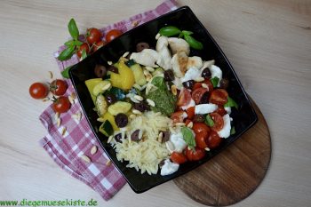 Nun die Bowl anrichten: Risoni, Pfannengemüse, Tomate-Mozzarella und Hühnchenstücke auf 4 Schüsseln aufteilen. Mit Oliven und Pinienkernen bestreuen und je 1 TL Pesto dazu geben.