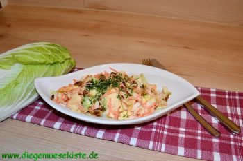 Chinakohl putzen und die Blätter in dünne Streifen schneiden. Den Apfel vierteln, entkernen und in dünne Stücke schneiden. Die Möhre waschen, evtl. schälen und fein raspeln. Die Walnusskerne grob hacken.