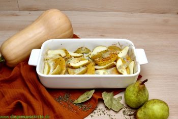 Kürbis im Wechsel mit den Birnen und Gorgonzolastückchen in eine Auflaufform schichten und mit Salz und Pfeffer würzen.