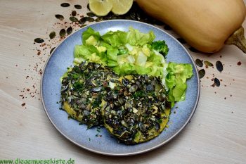 Das Mehl mit ca. 120ml kaltem Wasser in einem tiefen Teller verrühren. Die Kürbisscheiben von beiden Seiten kräftig mit Salt würzen. Anschließend nach und nach zuerst in der Mehlmischung und anschließend in der Nussmischung wenden und panieren.Nun die Scheiben in einer beschichteten Pfanne in etwas Brat Olivenöl von jeder Seite bei mittlerer Hitze goldbraun braten.