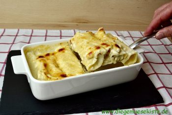 Cannelloni mit der Béchamel übergießen, mit Parmesan betreuen und im vorgeheizten Backofen bei 220°C ca. 30 – 35 Minuten überbacken.