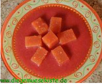 Das Gelee auf ein Platte stürzen, in Würfel schneiden und mit einem frischen Fruchtmus nach Ihrer Wahl servieren.