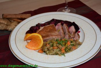 Zum Schluss die Rote Bete mit dem Linsensalat und der Entenbrust auf Tellern anrichten und servieren.