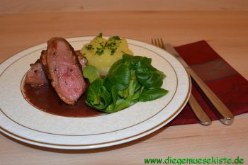 Dazu passen Kartoffelknödel und Feldsalat. Auch Vanille-Möhren passen prima dazu.