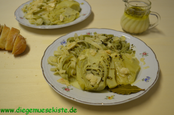 Die Fenchelknollen waschen, putzen und halbieren. In der Brühe bei geschlossenem Topf ca. 15 min köcheln lassen.