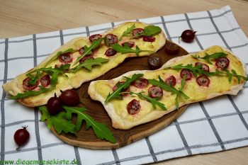 Auf die Bleche verteilen. Mit einem Pinsel mit Wasser bestreichen. Dünn mit Senfcreme bestreichen und mit Stachelbeeren belegen. Im vorgeheizten Backofen bei 225°C etwa 10 Minuten backen. Rucola auf die fertigen Streifen verteilen und servieren.