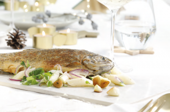 Die Forelle mit den Schwarzwurzeln und der Orangen-Mandelbutter servieren.