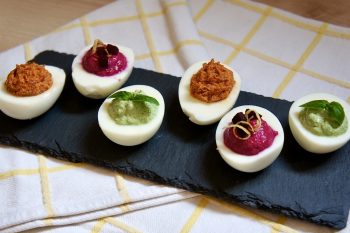 Die Eier halbieren und Eigelb entfernen (kann zum Beispiel für italienische Canestrelli-Plätzchen verwendet werden). Nun die Füllungen auf jeweils 1/3 der Eierhälften verteilen und mit den kleinen Rote Bete-Würfeln und Zitronenabrieb bzw. einigen kleinen Basilikum-Blättern dekorieren.