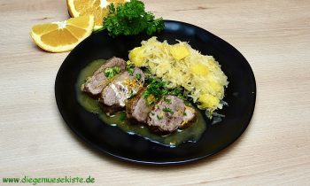 Gänsebrüste in Scheiben schneiden, mit dem Orangen-Sauerkraut auf vier Teller verteilen und mit der gehackten Petersilie bestreuen. Eventuell mit Orangenscheiben garnieren.