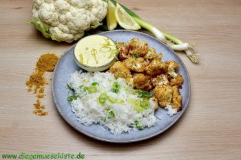 Blumenkohl mit Reis und Joghurt-Dip auf 4 Tellern anrichten. Eventuell mit Zitronenstücken garnieren.