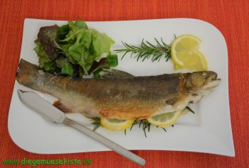 Nun die Saiblinge in Mehl wenden, etwas Öl in einer Pfanne erhitzen und die Saiblinge einlegen. Auf beiden Seiten insgesamt 20 bis 25 Minuten goldbraun braten bis die Fische gar sind. Auf vorgewärmten Tellern anrichten.