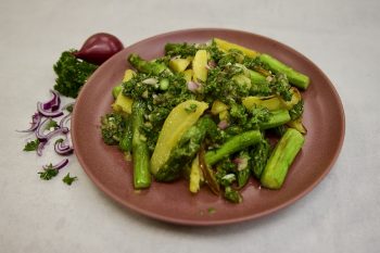 Das Backblech aus dem Ofen nehmen und die Vinaigrette über das Gemüse träufeln.