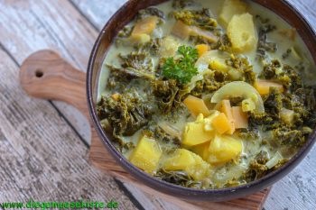 Bratöl in einem Top erhitzen. Steckrübenwürfel und Zwiebelstreifen zufügen und leicht anbraten. Grünkohl zufügen und kurz mitdünsten. Wasser und Kokosmilch zugeben und zum Kochen bringen. Currypaste zufügen. Kartoffelwürfel ebenfalls zugeben, nach Geschmack mit Salz und Pfeffer würzen und alles zusammen köcheln lassen, bis das Gemüse weich ist. Bei Bedarf noch etwas Flüssigkeit nachgießen.