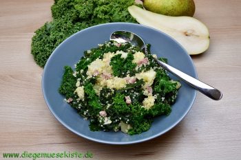 Inzwischen Hirse nach Packungsanleitung zubereiten. Birnen waschen und in Würfel schneiden. Beides zum fertigen Grünkohl geben, nochmals abschmecken und alles zusammen 5 Minuten köcheln lassen. Auf 4 Teller verteilen und servieren.
