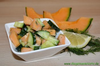 Melone halbieren, Kerne entfernen und eine Hälfte in Spalten schneiden. Fruchtfleisch von der Schale schneiden und würfeln. Gurken waschen und würfeln. Alle Zutaten mischen und nochmals abschmecken.