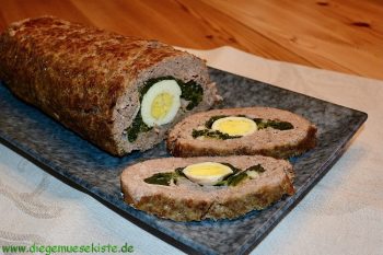 Hackfleischmasse auf einem Backpapier verteilen, so dass ein ca. 1/2cm dickes Rechteck entsteht, dessen längere Seite zu Ihnen zeigt. Nacheinander mit Spinat, Schinken- und Käsescheiben belegen. Am oberen Ende ca. 4cm frei lassen, damit die Rolle später geschlossen werden kann. Die hartgekochten Eier der Länge nach, nebeneinander am unteren Rand auf den Teig legen.