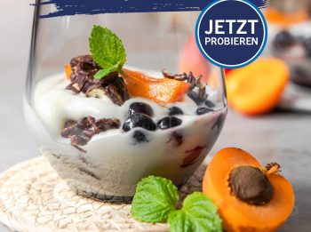 Heidelbeeren und Aprikosen mit der Joghurtsahne und den Schokocrossies in Gläsern schichten.