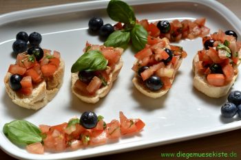 Tomaten, Knoblauch und Basilikum mischen. Nach Geschmack mit Salz, Pfeffer und Zucker würzen. Essig und Olivenöl untermischen. Die Heidelbeeren vorsichtig unterheben und auf die Brotscheiben geben, mit den restlichen Basilikum-Blättern garnieren und servieren.