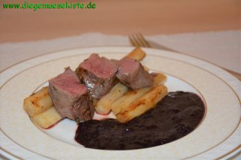 Das Fleisch von Sehnen und Fett befreien, mit Thymian, Salz und Pfeffer bestreuen und in einer Pfanne in etwas Butter und Olivenöl von allen Seiten anbraten. Im vorgeheizten Backofen 10 – 15 Minuten garen, bis das Fleisch innen schön rosa ist.