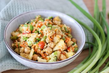 Die Karotten schälen und in eine Schüssel reiben. Den Apfel entkernen und in Würfel schneiden. Die Frühlingszwiebel in feine Ringe schneiden. Die Gurke halbieren, längs schneiden und würfeln. Kichererbsen abtropfen. Alles zur Schüssel geben.