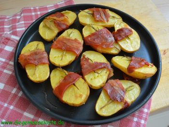 Auf ein geöltes Backblech geben und im vorgeheizten Backofen bei 180°C etwa 50 Minuten backen, bis die Kartoffeln weich sind und der Schinken schön knusprig ist.