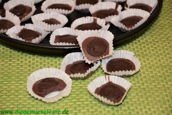 Die restliche Zartbitterkuvertüre im Wasserbad schmelzen und auf jedes Förmchen einen Tropfen geben. Im Kühlschrank lagern und kühl genießen.