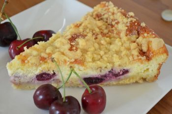 2/3 der Streusel in eine gefettete Kuchenform drücken und die Kirschen darauf verteilen, dabei am Rand ca. 2 cm Abstand lassen.