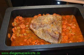 Die Zwiebeln und Gemüsestücke ins heiße Fett geben und ebenfalls anbraten. Mit dem Tomatenmark, Majoran, der Fleischbrühe und dem Rotwein ablöschen. Fleisch wieder zufügen und das Ganze langsam im vorgeheizten Backofen bei 180°C etwa 60 bis 80 Minuten bei geschlossenem Deckel schmoren lassen. Etwa nach der Hälfte der Zeit den Braten einmal wenden. Sollte die Flüssigkeit zu sehr eingekocht sein, nochmals etwas Fleischfond oder Wasser nachgießen.