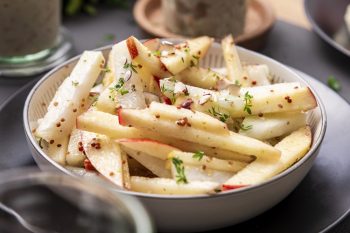Kohlrabi schälen und in Stifte schneiden. Apfel waschen, vierteln und ebenfalls stiften.
