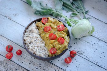 In einer Pfanne etwas Kokosöl erhitzen. Die Kohlrabiwürfen darin von allen Seiten anbraten. Dann die Zwiebelwürfel hinzugeben und kurz mitbraten.