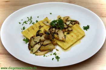 Die Polenta-Scheiben in einer Pfanne in Olivenöl von beiden Seiten anbraten. Zusammen mit den Kräuterseitlingen servieren.