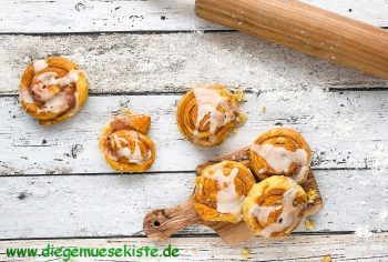 Die Kürbis-Zimtschnecken mit ausreichend Abstand auf ein Backblech geben und im Ofen 30 Minuten backen.