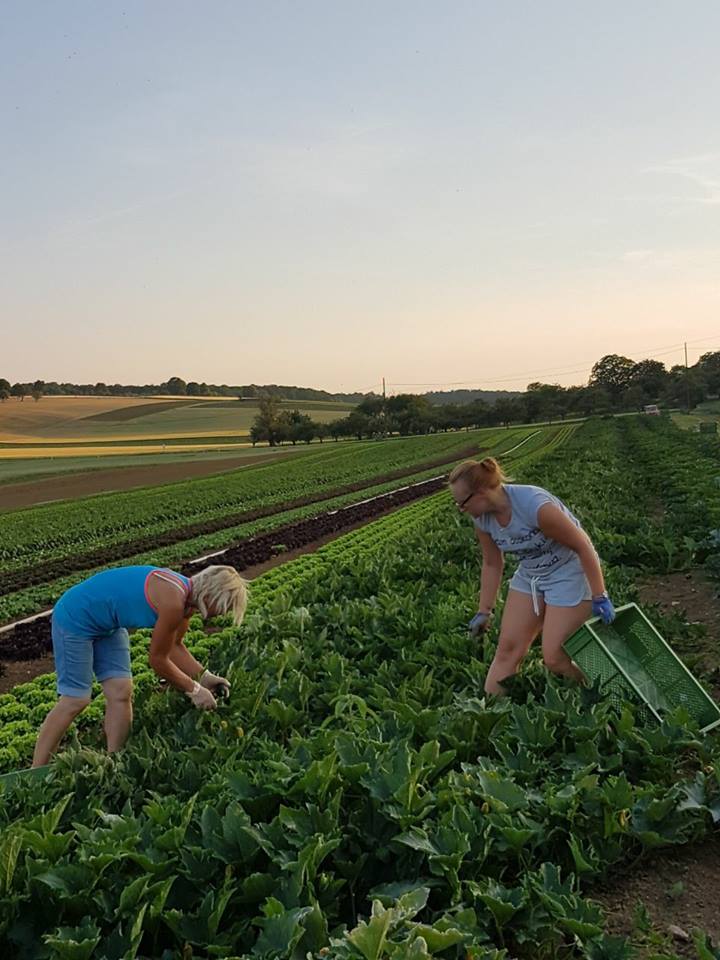 Ein weiteres Anliegen war es, so viele Gemüsearten wie möglich selber anzubauen. Die Fläche hat sich von anfangs 5000 qm auf zur Zeit 160.000 qm erweitert. Das entspricht in etwa der Größe von 23 Fußballfeldern. Dazu kommt noch 10.000 qm Fläche im Folienhaus. Die Jungpflanzen werden selber herangezogen und dabei wird soweit möglich auch Saatgut aus ökologischer Erzeugung verwendet. Als Gründüngung werden z.B. Leguminosen oder Grasarten gesät. Leguminosen sind eine Pflanzenfamilie, die den in der Luft befindlichen Stickstoff sammeln und im Boden für die anderen Pflanzen verfügbar machen können. Im Gewächshaus werden Nützlinge wie Schlupfwespen oder Raubmilben eingesetzt, im Freiland werden gefährdete Kulturen mit Netzen abgedeckt, um Gemüsefliegen und andere Schädlinge abzuwehren. Zur Arbeitserleichterung werden im Gewächshaus Hummeln zur Bestäubung von Tomaten eingesetzt. Ohne die Insekten wäre zeitaufwendige Handarbeit nötig – z.B. müssten die Tomaten einzeln geschüttelt werden.