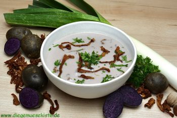 Kartoffeln schälen, Lauch putzen und beides kleinschneiden. In einem Topf in etwas Öl anschwitzen. Gemüsefond und Lorbeerblätter zugeben. Etwa 15 bis 20 Minuten köcheln lassen, bis das Gemüse weich ist und anschließend pürieren.