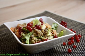 Joghurt mit dem Essig verrühren, mit Salz und Pfeffer abschmecken. Salat, Linsengemüse und Dressing mischen, zum Schluss die Johannisbeeren zugeben, vorsichtig untermischen und den Salat lauwarm servieren.