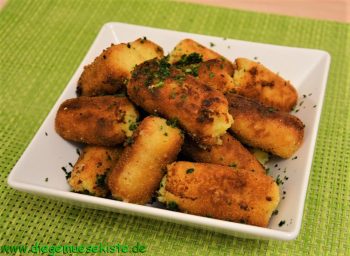 Kartoffeln waschen und in reichlich Salzwasser oder im Dampfgarer weichkochen. Leicht abkühlen lassen, schälen und mit einem Kartoffelstampfer zerdrücken.  Kartoffelmasse mit Manchego, Ziegenkäse, Chilipaste, Milch, Eigelb, Semmelbrösel, Stärke, Petersilie, etwas Salz und Muskat zu einer glatten Masse verkneten. Aus der Masse 16 Kroketten formen.