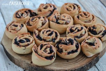 Den Teig in Streifen schneiden und diese zu Schnecken aufrollen. Ofen auf 200°C vorheizen, die Teiglinge so lang auf ein Backblech geben und kurz ruhen lassen. Im Ofen circa 35 Minuten backen.