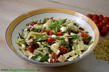 Nudeln in eine Schüssel geben, restliche Zutaten zufügen und vorsichtig unterheben. Nach Geschmack Olivenöl, Condimento Bianco und Zitronenabrieb zufügen und mit Salz und Pfeffer abschmecken.