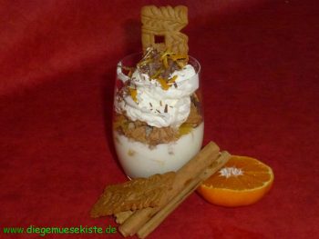 ebenfalls in die Gläser füllen. Sahne schlagen und darauf geben und mit ganzem Spekulatius, Orangenstreifen und frischen “Schokoladestreuseln” (die Schokolade mit der Gemüsereibe reiben) dekorieren.
