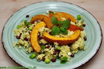 Hirse auf 4 Teller verteilen und gebackene Kürbisspalten darauf anrichten. Sofort servieren.