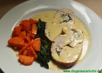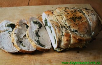 Die Putenbrust der Länge nach auf-, aber nicht durchschneiden. Mit dem restlichen Ricotta bestreichen, die Spinat-Ricotta-Mischung darauf verteilen und das Ganze einrollen. Mit Küchengarn umwickeln. Vorsichtig mit Salz und Pfeffer würzen und in einen Bräter legen.