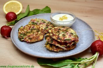 Radieschen putzen, waschen, grob reiben. Radieschengrün waschen und grob hacken. Mit 1⁄2 TL Salz mischen und ca. 10 Minuten ziehen lassen. Radieschen gut ausdrücken und mit dem Grün, den Semmelbröseln, der Stärke, 2 EL Joghurt und dem Ei verrühren. Nach Geschmack mit Salz und Pfeffer würzen.