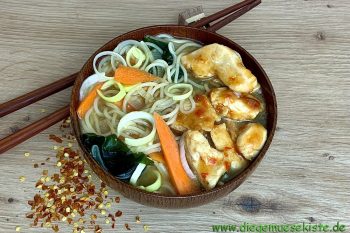 Brühe und 400ml Wasser in einem Topf aufkochen. Möhren, Lauch, eine Messerspitze Chiliflocken und Wakame zugeben. Ca. 3 Minuten köcheln lassen.