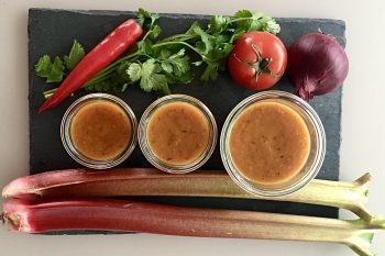 Kümmel und Senfsamen mit einem Mörser grob zerstoßen und bei mittlerer Hitze im Olivenöl anrösten. Zwiebeln zugeben ebenfalls anschwitzen. Rhabarber, Tomaten, Chilipaste, Koriander, Essig und Zucker zufügen und aufkochen. Bei geringer Hitze 20 Minuten im geschlossenen Topf köcheln lassen, gelegentlich umrühren.