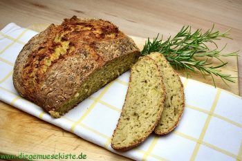 Die geriebenen Kartoffeln ausdrücken. Geriebene und gestampfte Kartoffeln und Milch zum Mehl geben. Erst mit den Knethaken des Rührgeräts, dann mit den Händen auf einem bemehlten Holzbrett zu einem glatten Teig verkneten und zu einem runden Laib formen. Mit dem restlichen Rosmarin von allen Seiten einreiben, mit grobem Meersalz bestreuen und die Oberfläche kreuzweise einschneiden.